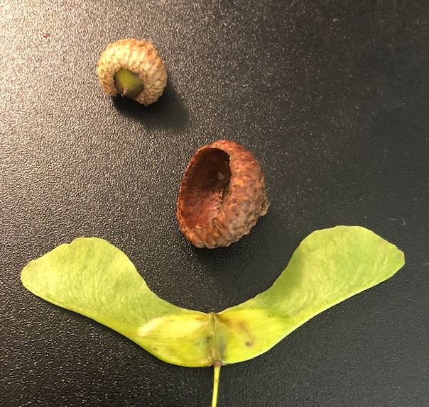 I walked past / over/ around the items in this picture my whole life. Every day I walk I see them and every day I remember that an acorn used to be my tool for the empty can arcade. The acorn hat as I called it was my whistle before I learned to whistle really loud. The Maple Tree Seed, some people call them whirly birds and some call them Pinocchio noses because you can split one half at the bottom and its sticky resin stuck to your nose and you could run around looking silly and not caring. I however used to call them helicopters because they spun as they fell and I thought it looked graceful. Side note: Inside the green whirly bird is a maple tree seed. It will fall to the ground and grow in the same way as the sunflower.